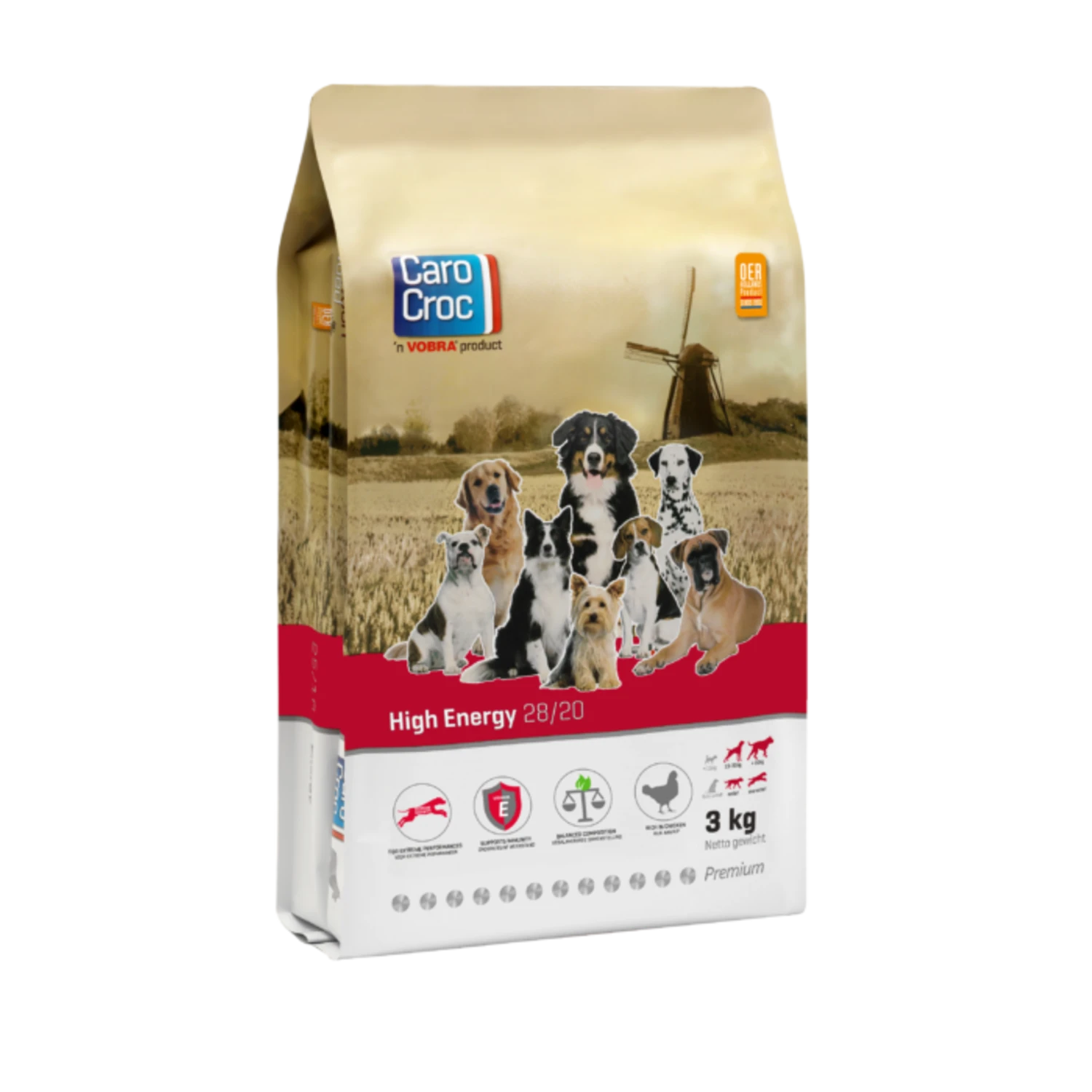- Dankzij de uitgebalanceerde samenstelling met hoogwaardige grondstoffen zoals dierlijke eiwitten, vetten, mineralen en een optimale verhouding omega-3 en -6 vetzuren, biedt CaroCroc High Energy je hond datgene wat hij nodig heeft. CaroCroc High Energy bevat 28% eiwit en 20% vet.