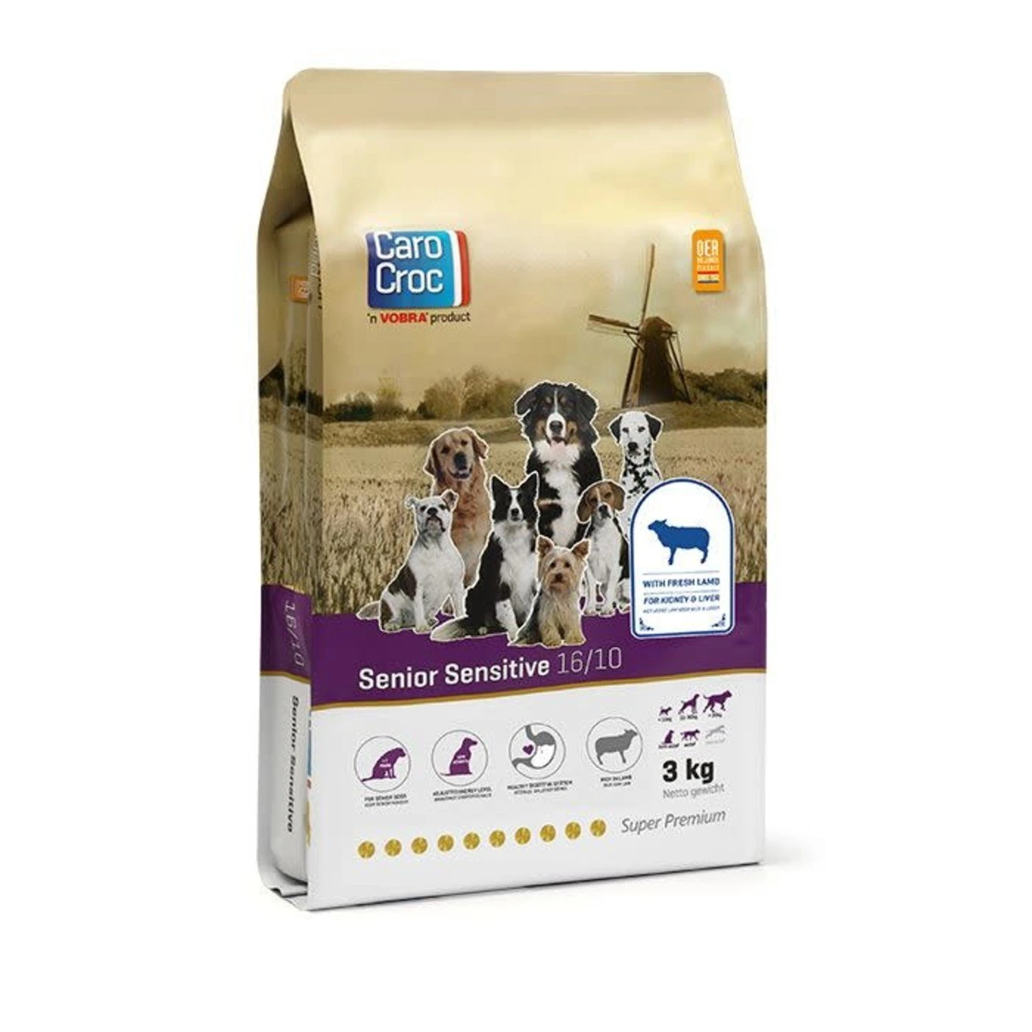 De samenstelling van CaroCroc Senior Sensitive is afgestemd op de behoefte van oudere honden. Het ondersteunt de nier- en leverfunctie. CaroCroc Senior Sensitive bevat omega-3 en -6 vetzuren en 37% lam.