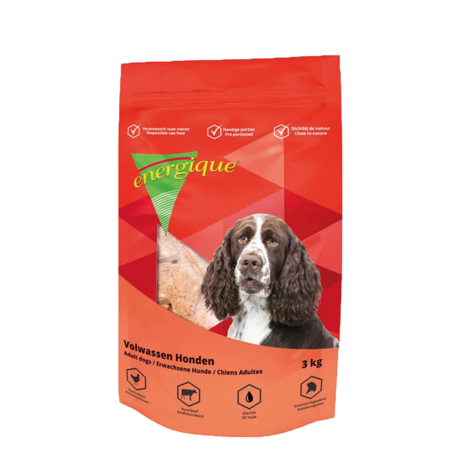 Energique voor volwassen honden is een compleet samengestelde vers vleesmaaltijd speciaal ontwikkeld om in de natuurlijke voedingsbehoeften van volwassen honden te voorzien. Kwalitatief hoogwaardige vleesbronnen afkomstig van kip en rund leveren de benodigde voedingsstoffen voor een gezonde hond. De goede verteerbaarheid van de voeding en toevoeging van vezels afkomstig uit zowel dierlijke als plantaardige bronnen ondersteunen een gezonde darmwerking en een stevige ontlasting.  Zonnebloemolie en zalmolie leveren de benodigde essentiële vetzuren voor een gezonde huid en vacht. Energique Volwassen Honden kan vanaf de leeftijd van ongeveer 10 maanden (kleine en middelgrote rassen) tot 12 maanden (grote rassen) gevoerd worden.